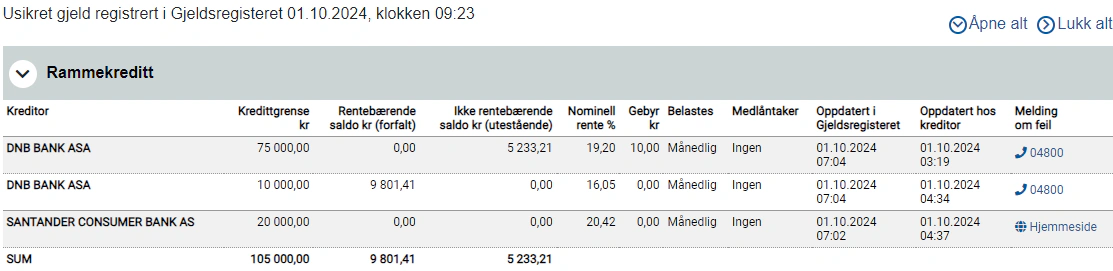 Har du kredittkort eller en annen form for usikret kreditt, ser du hvem du har fått kreditt av. Du kan også se hvilken rente du har fått i tillegg til den utestående saldoen.